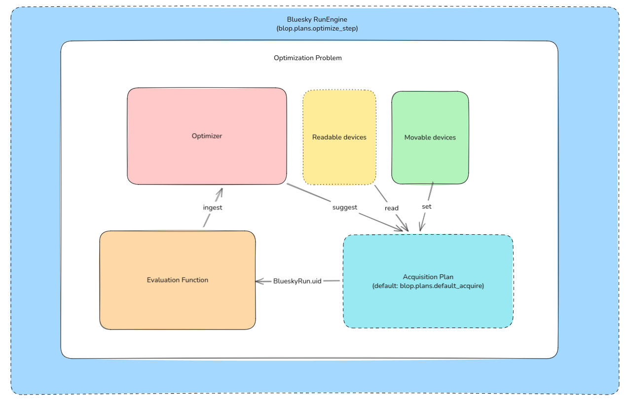 This protocol design allows you to pick and choose only the components you care about with regard to your optimization workflow. While Blop provides a default optimizer and acquisition plan, you are free to implement your own!